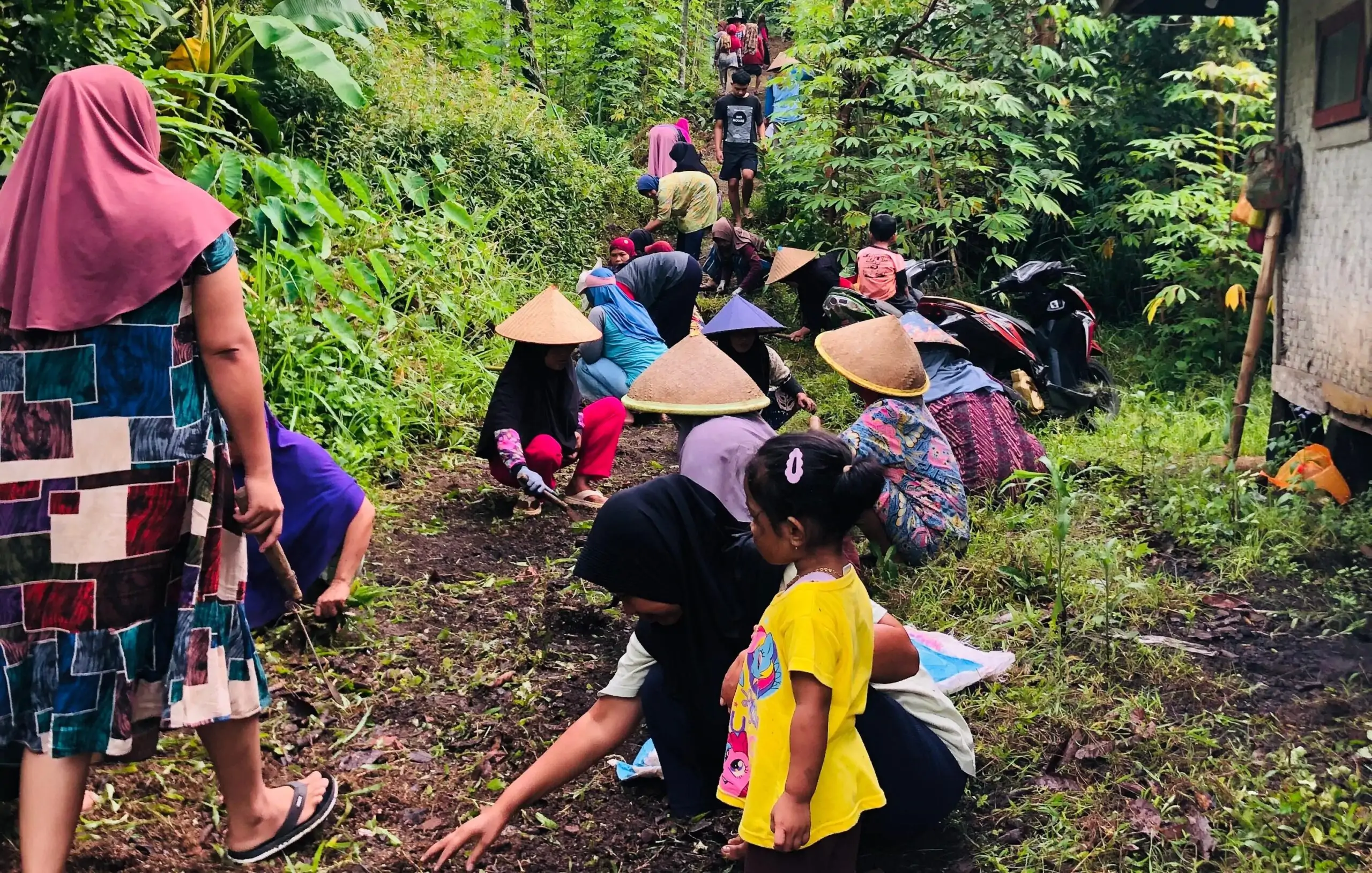 Hari itu, Ibu Ranti memberikan sambutan dengan hangat, “Mari kita bersama-sama membangun jalan ini demi kenyamanan dan keamanan kita semua.” Pesan tersebut disambut dengan antusiasme tinggi. Warga dari berbagai usia, mulai dari anak-anak hingga orang dewasa, berkumpul dengan peralatan sederhana seperti cangkul, garpu tanah atau lencog dan arir rumput. Keceriaan dan tawa mengisi udara, menciptakan suasana yang penuh keakraban.